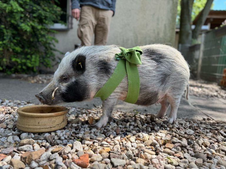 Für ein faires Training ist es wichtig, dass sich alle Beteiligten wohl fühlen. Da eine Teilnehmerin schon Vorerfahrungen mit Bissen durch Schweine hatte, war für sie ein kleinschrittiger Aufbau, bei den Berührungen des Minipigs, die zunächst mit einem verlängertem Arm erfolgten, sinnvoll. Parallel lernte „Birk“, dass er durch ein ruhiges Positionieren des Kopfes im leeren Futternapf signalisieren kann, dass er bereit für den nächsten Schritt ist.
