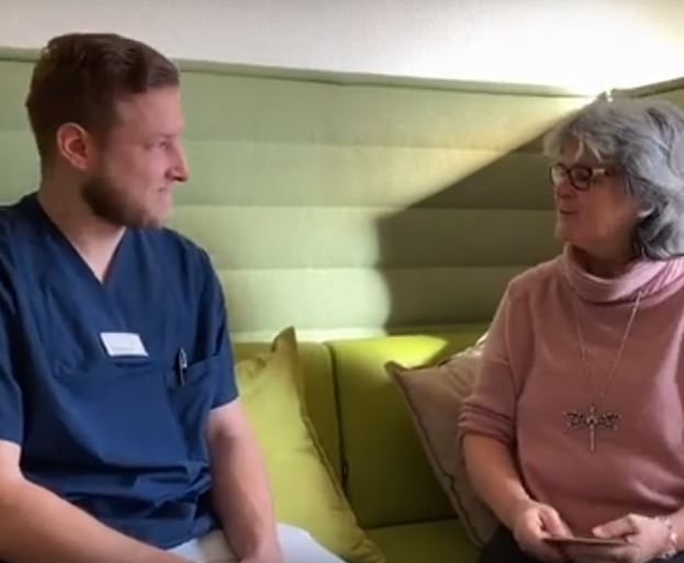 Anke Recktenwald (Tellington TTouch Instruktorin aus Deutschland) fürht ein Interview mit einem Mitarbeiter eines Hospizes.
